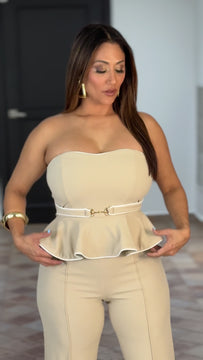 Elegant jumpsuit with ruffles that give the illusion of a crop top with gold detail, palazzo style bottom for more formal events or outings.