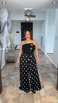 Chic meets playful in this jumpsuit featuring a sleek solid top and flowy pleated wide-leg pants with a bold polka dot design. Lightweight, comfortable, and effortlessly stylish-perfect for day-to-night looks.
